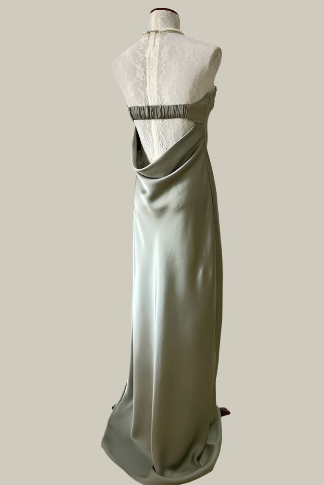 This chic strapless sage green maxi dress features a flattering neckline and an alluring open back design. Perfect for any occasion, it offers both style and comfort with its sleek and versatile design. Show off your shoulders and back in this must-have dress.