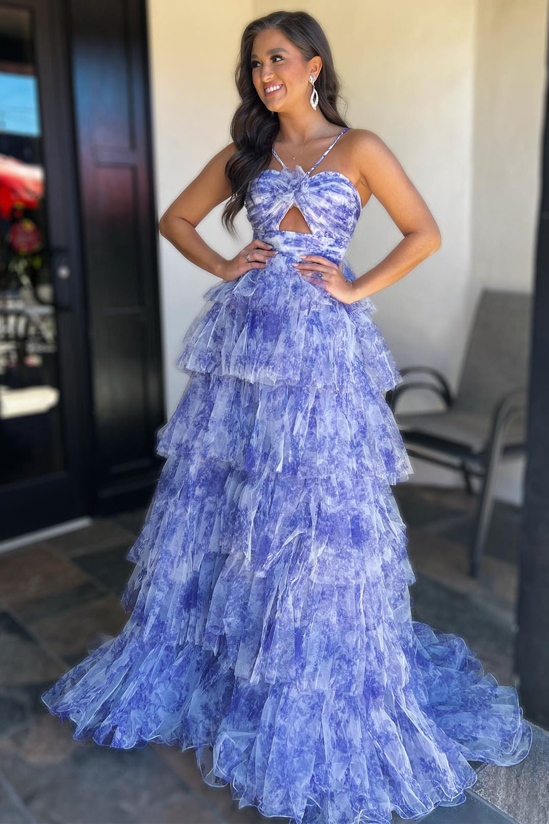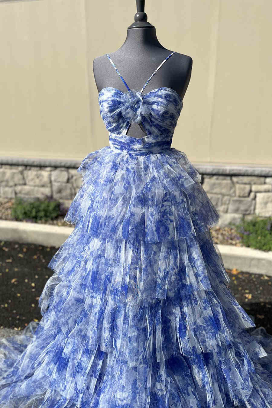 Straps Blue Floral Print Keyhole Ruffle A-line Long Prom Dress