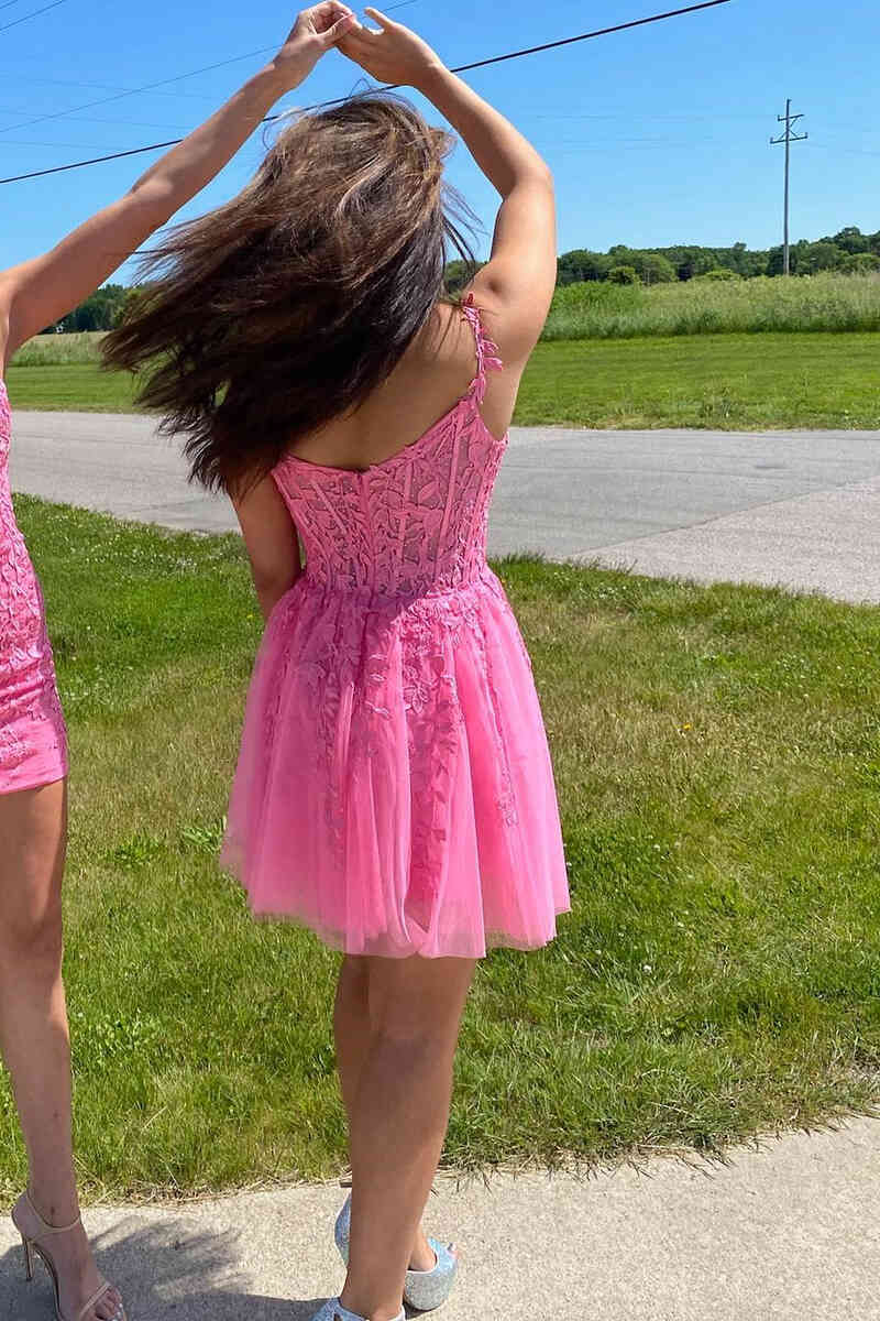 Elegant navy blue short homecoming dress features spaghetti straps, lace appliques and zipper back.