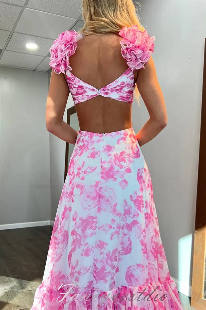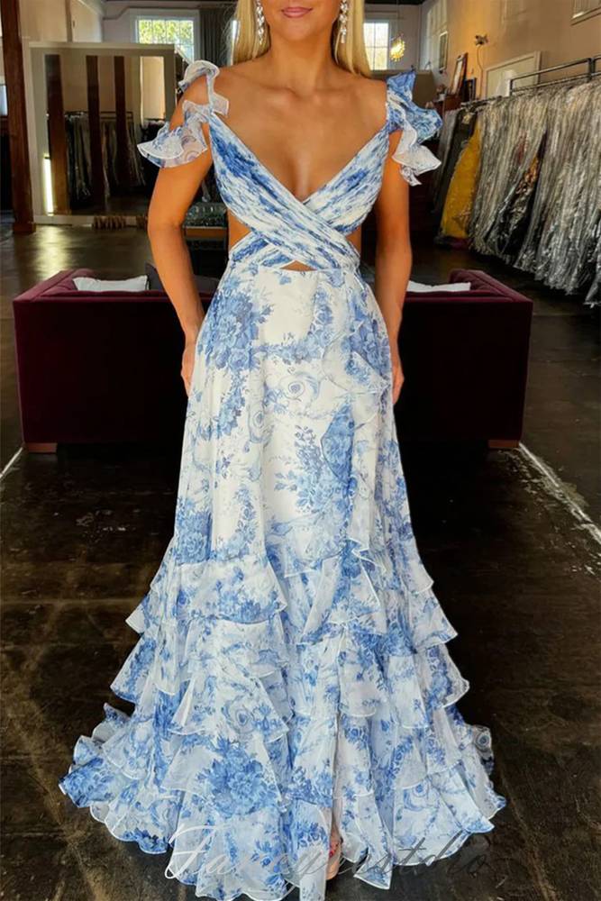 Expertly crafted with a striking blue floral print, this layered long prom dress is the epitome of elegance. The straps provide comfortable support while the layers create a stunning silhouette. Perfect for any formal occasion, this dress will make you stand out with its timeless beauty.
