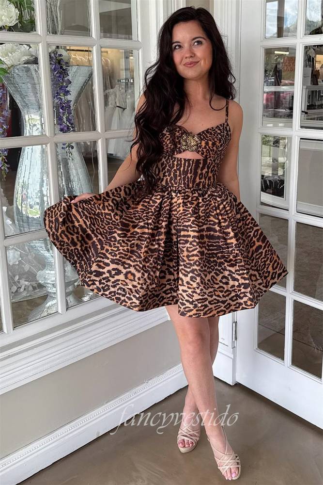 Straps Cheetah Print Cutout A-Line Homecoming Dress