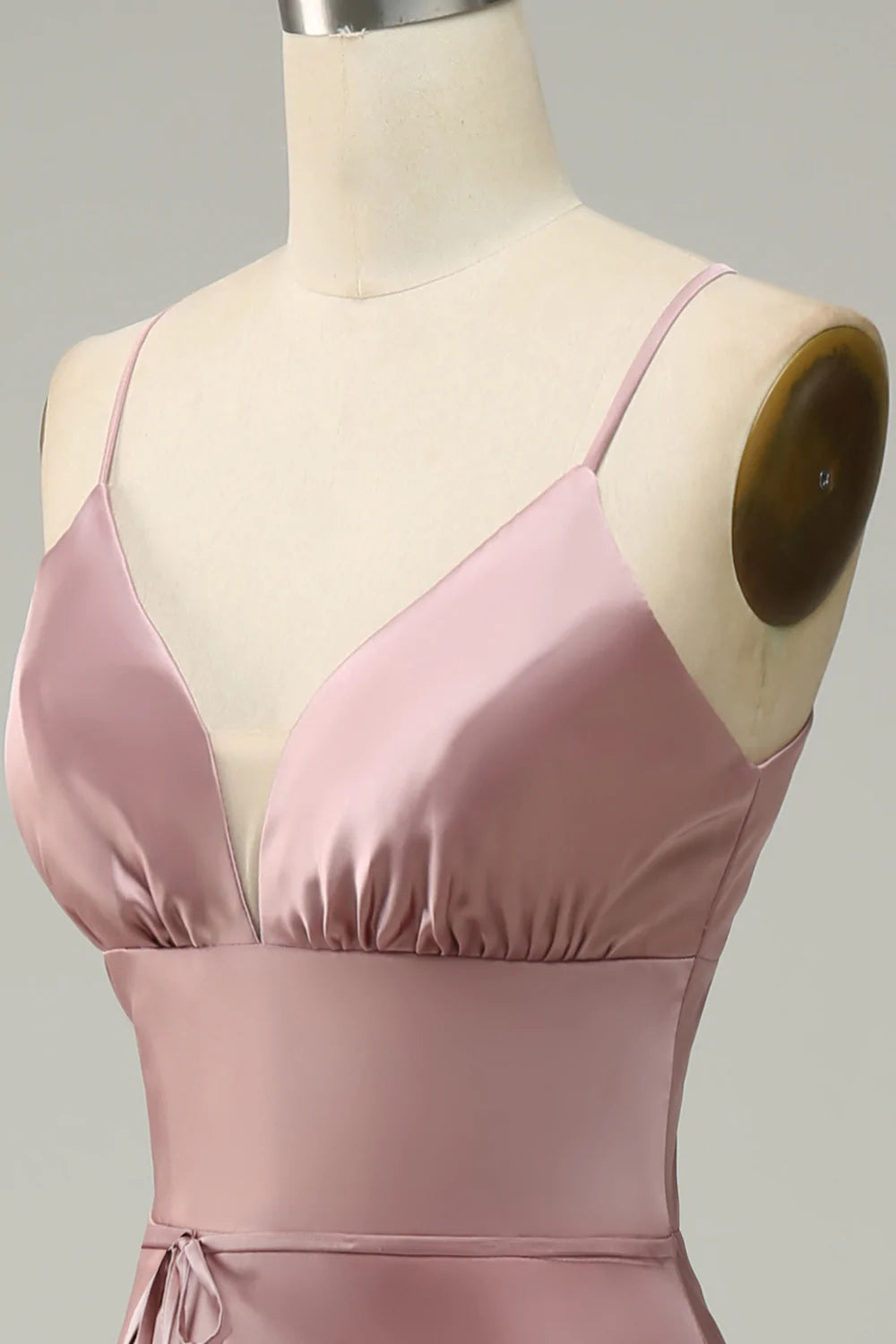 Fancyvestido this dusty rose long bridesmaid dress features spaghetti straps, high waist with belt, and zipper back.