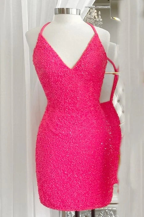 This short lavender tight homecoming dress features v-neck, sequins and criss cross back.
