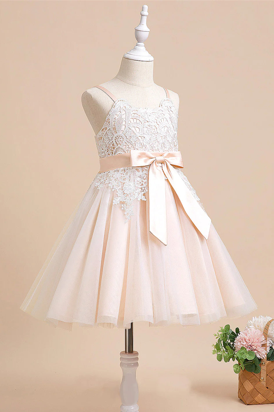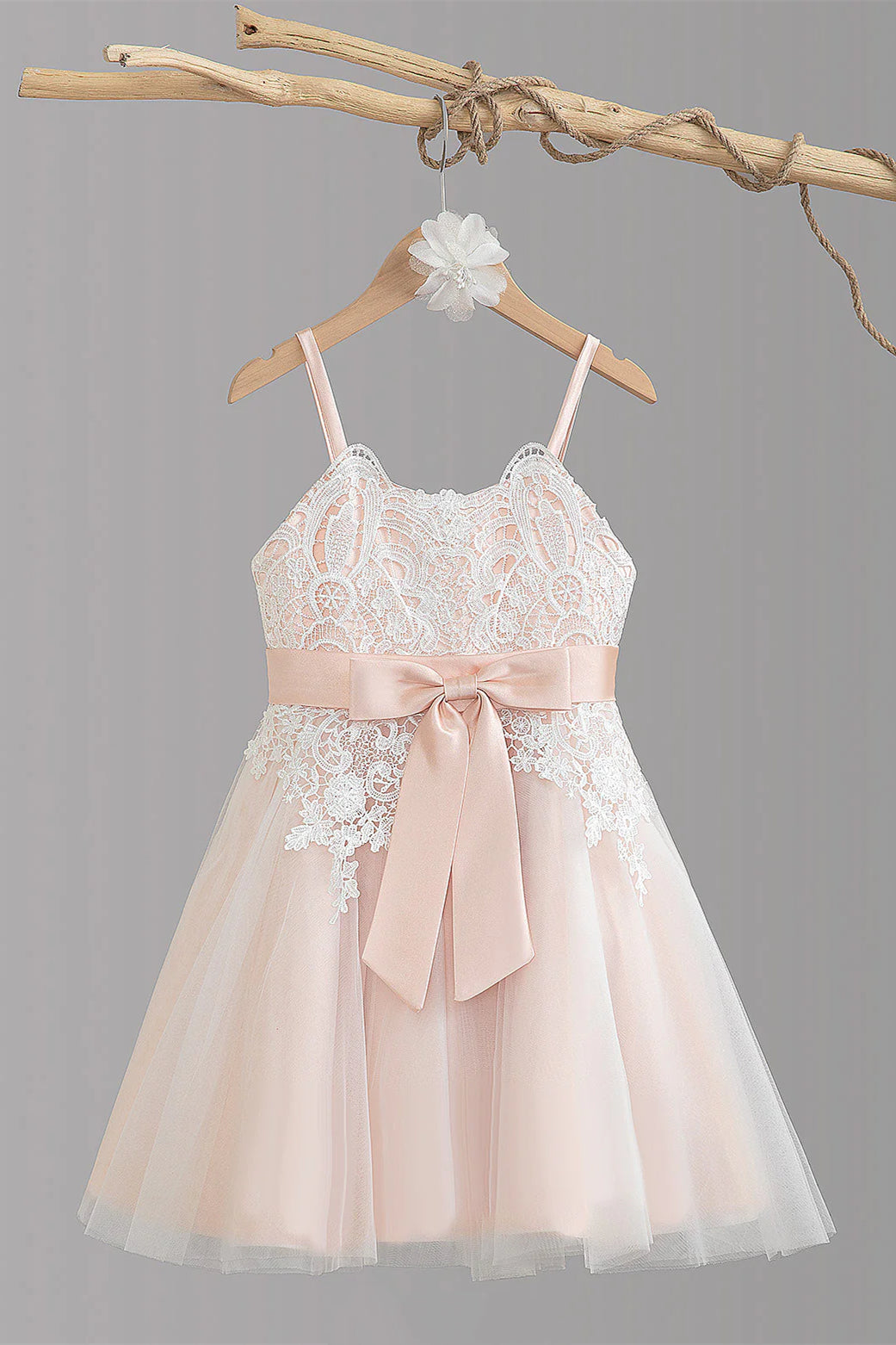 Elegant pearl pink flower girl dress features with spaghetti straps, lace top, bow belt and zipper back.