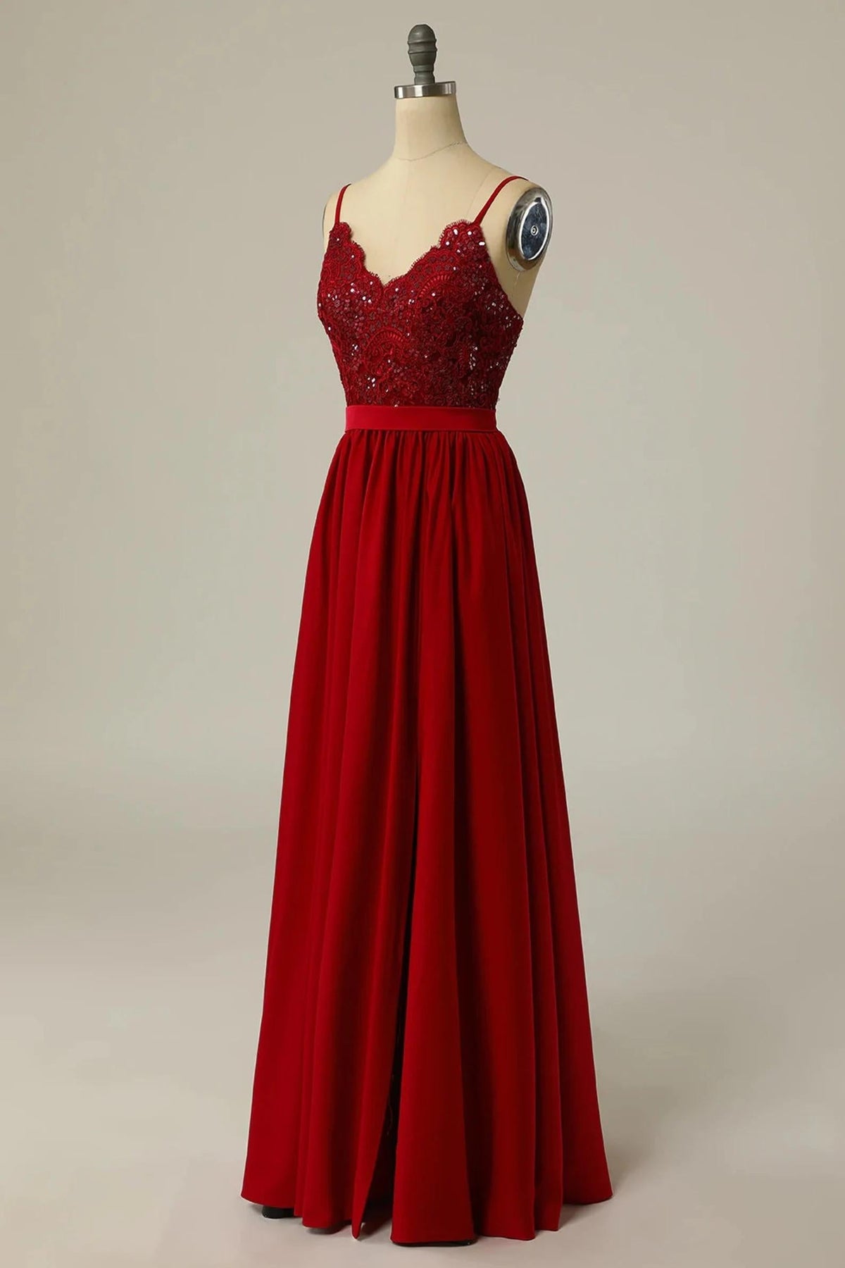 This versatile red floor-length bridesmaid dress features spaghetti straps, lace top with sequins, pleated a-line skirt, and a zipper back.