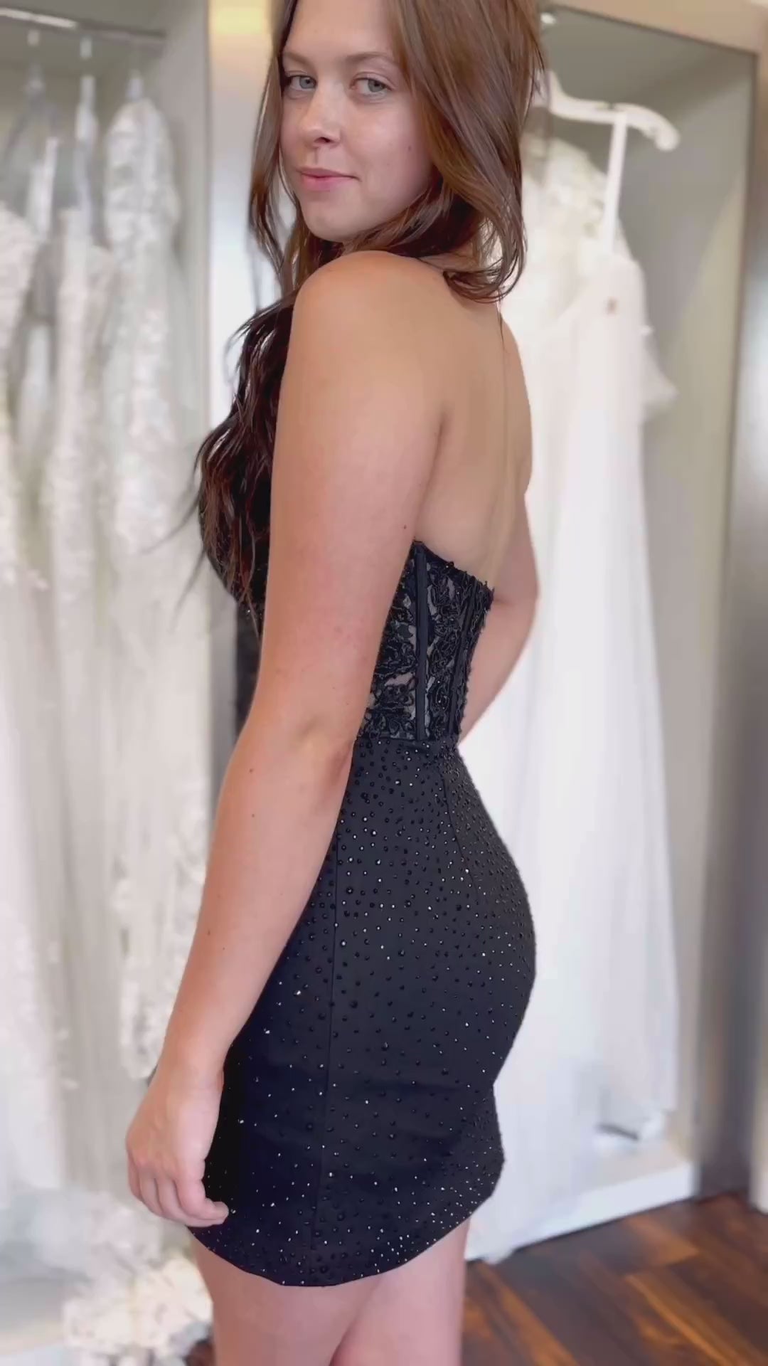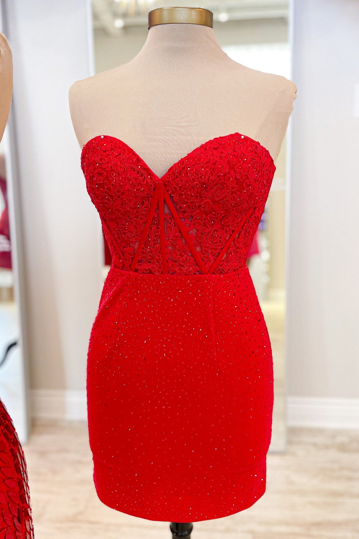Fancyvestido this black bodycon homecoming dress features sweetheart neckline, a sheer corset bodice with appliques, and a sheath skirt with hotfix rhinestones embellishments.
