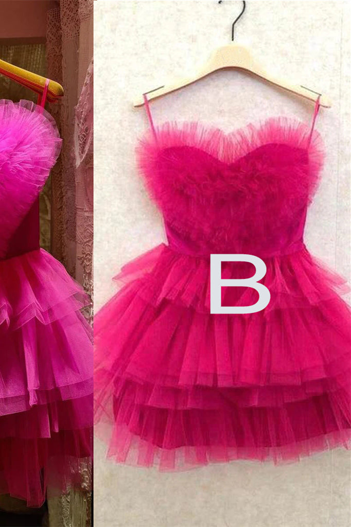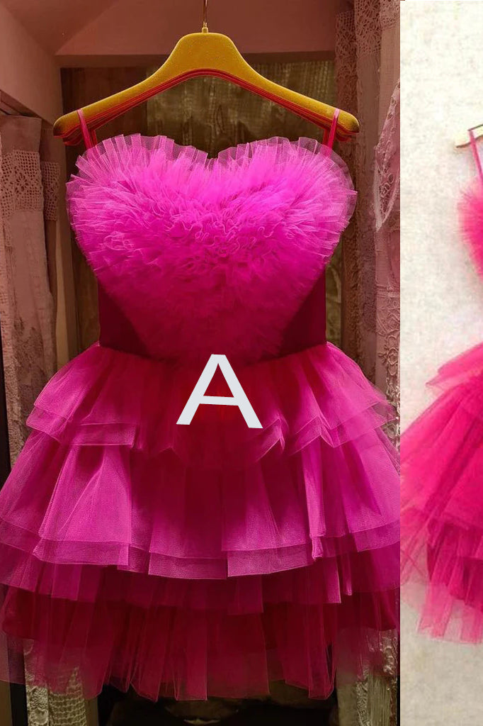 Fancyvestido this short hot pink homecoming dress features a sweetheart neckline with ruffles, a tiered a-line skirt, and a zipper back.