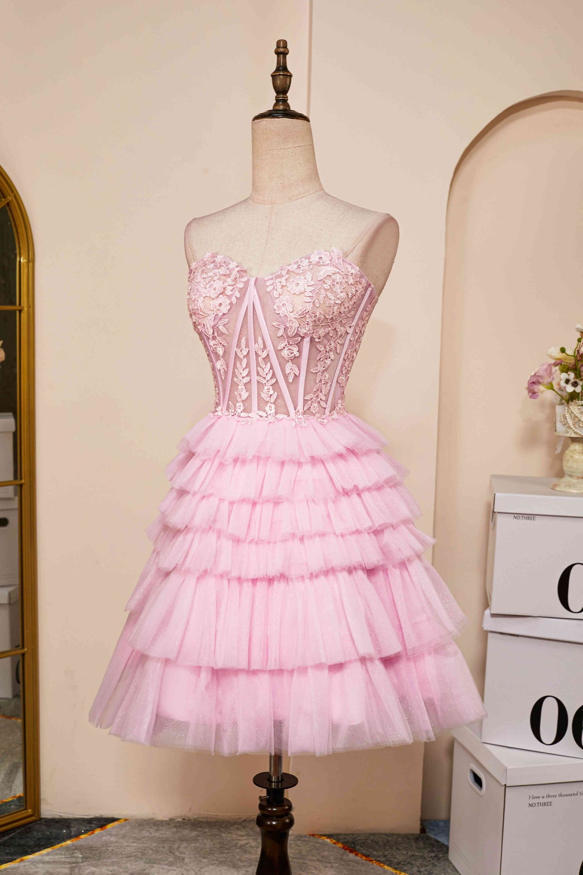 Fancyvestido this pink short homecoming dress features a sweetheart neckline, a sheer corset bodice with appliques, and a tiered a-line skirt.