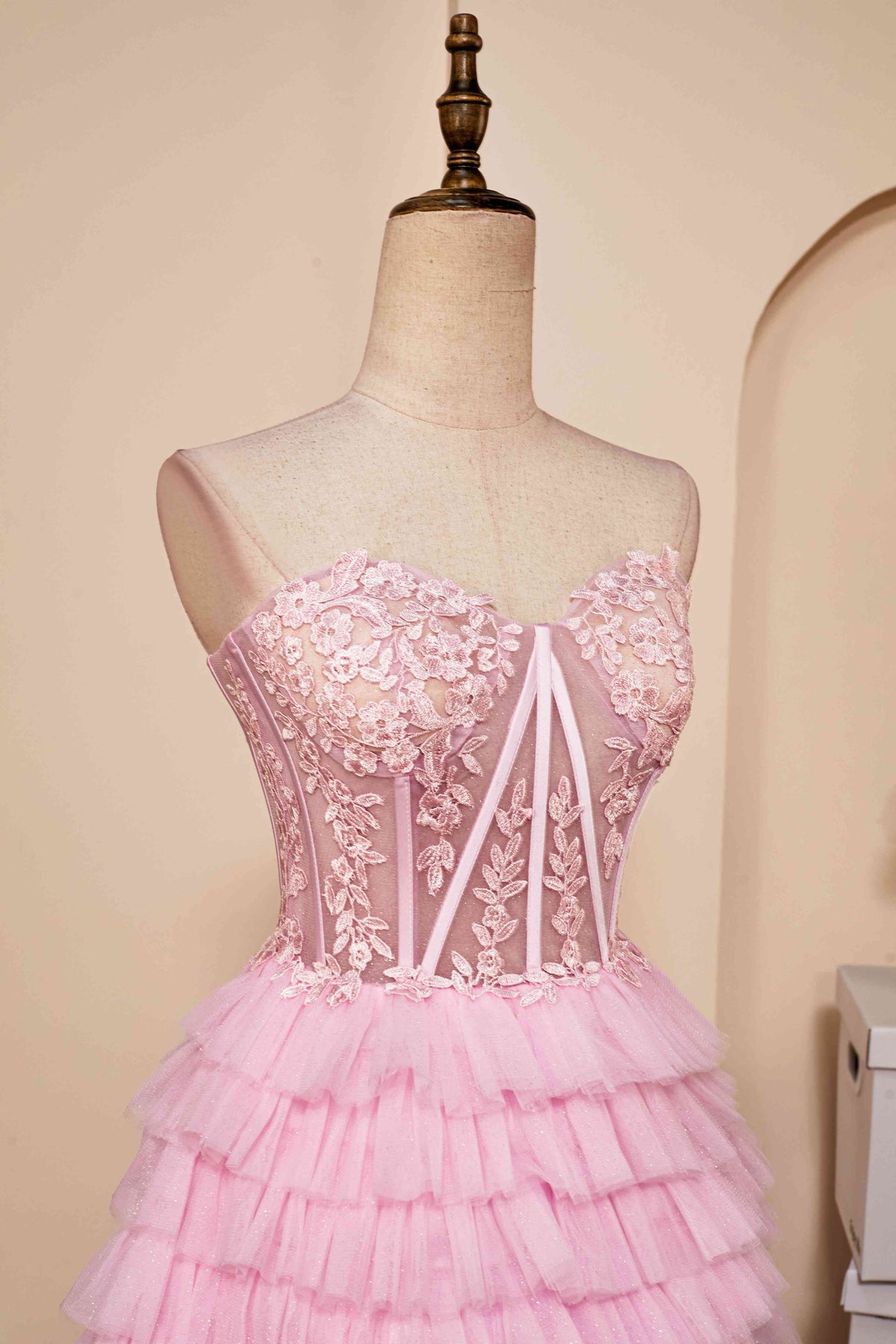Sweetheart Pink Lace Corset Tiered Short Homecoming Dress