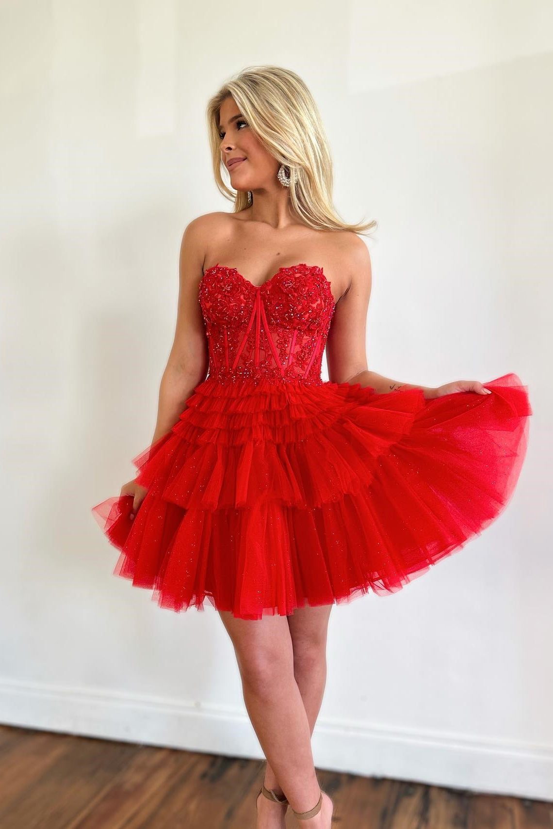 Sweetheart Red Lace Corset Tiered Short Homecoming Dress