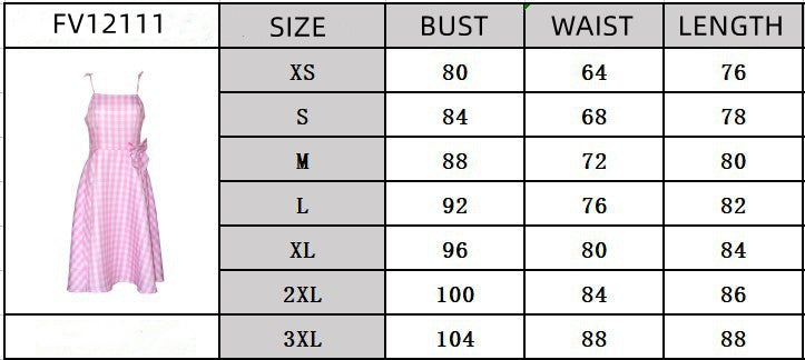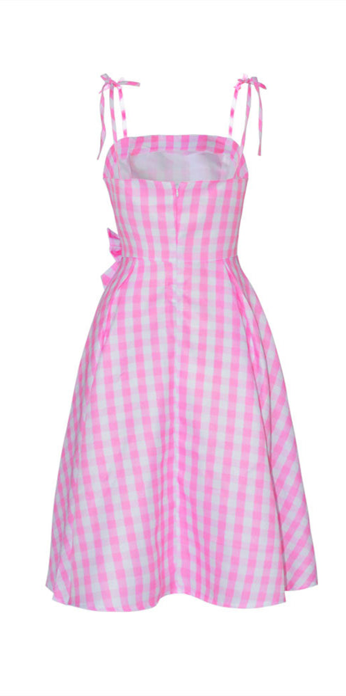 This vintage pink dress features a tie shoulder and a plaid a-line skirt with a bow.