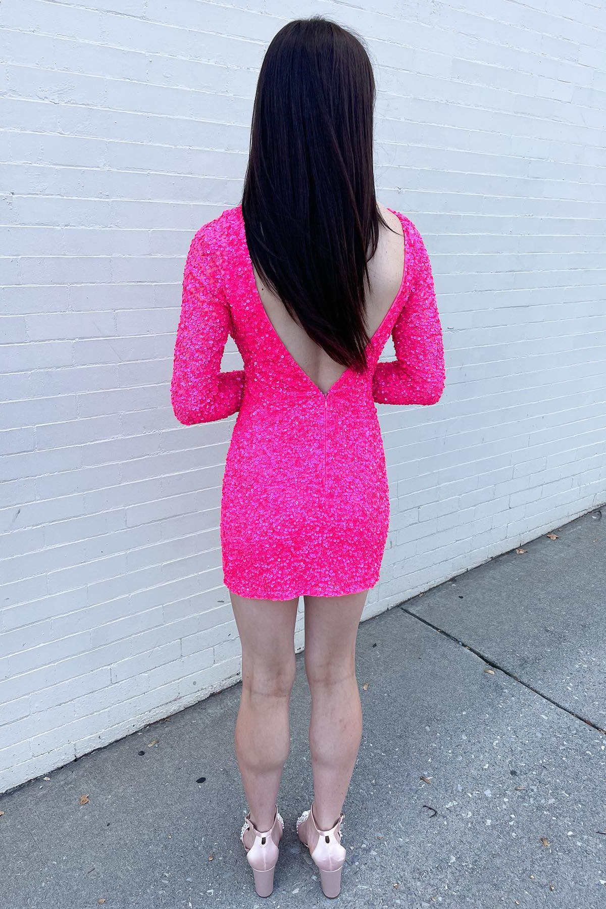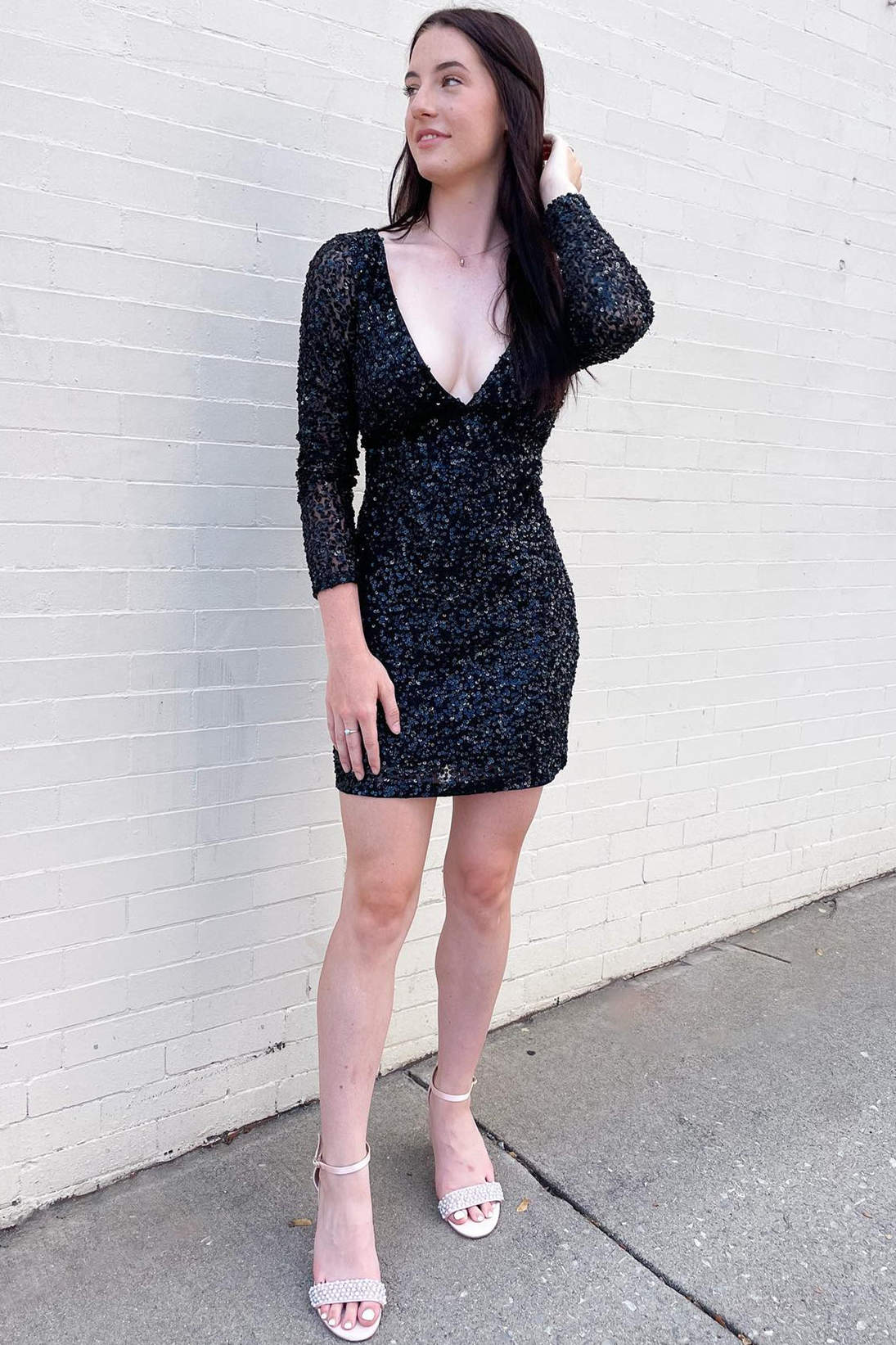 V-Neck Black Sequin Tight Homecoming Dress with Long Sleeves