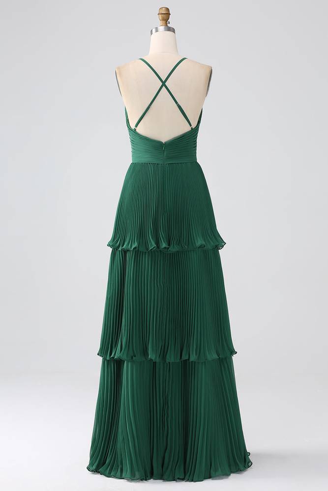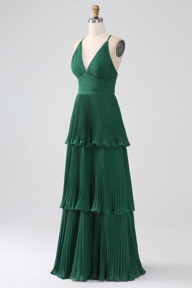 This elegant V-neck dress features a flattering empire waist and tiered A-line skirt, creating a flowy and feminine silhouette. The straps offer additional support, while the rich emerald green color adds a touch of sophistication. Perfect for any special occasion, this dress is sure to turn heads with its timeless design.