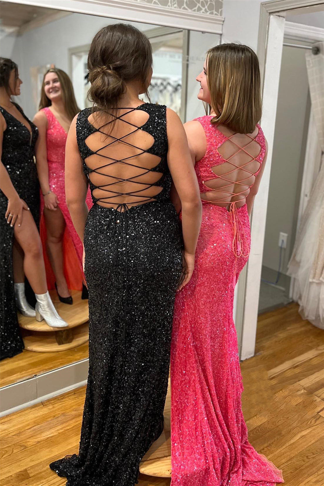 V-Neck Fitted Lace-Up Back Sequins Long Prom Dress with Slit