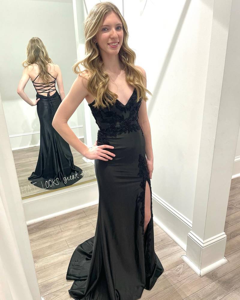 Get ready to turn heads with this stunning V-Neck Lace-Up Long Formal Dress! The flattering V-neckline and lace-up back accentuate your curves, while the mermaid style and slit add a touch of elegance. The delicate applique detailing adds a feminine and romantic touch to this must-have dress. Be the belle of the ball and exude confidence in this dress!