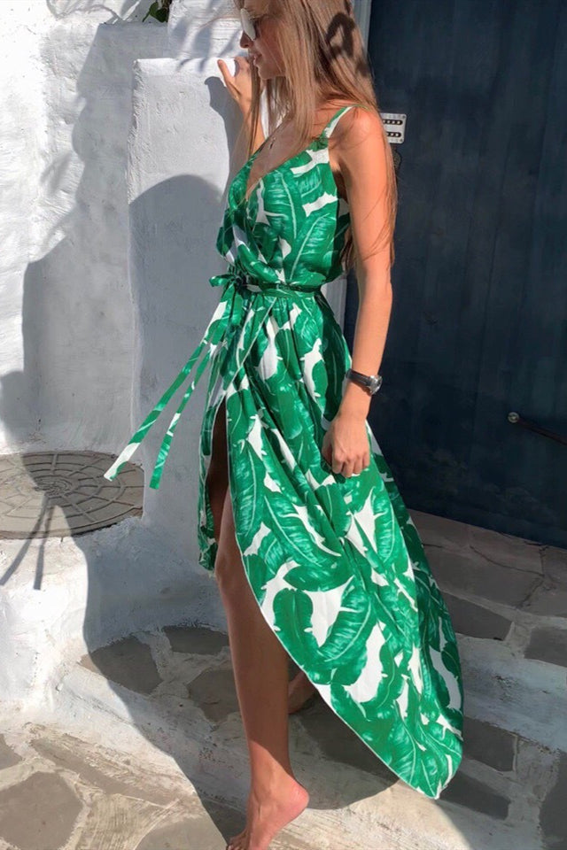 V-Neck Long Wrapped Green Summer Dress