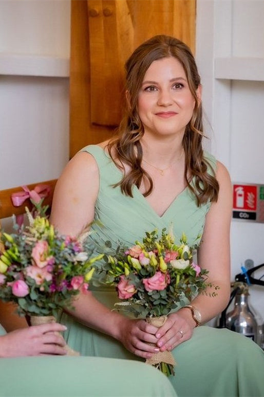 V-Neck Sage Green Pleated Chiffon Bridesmaid Dress