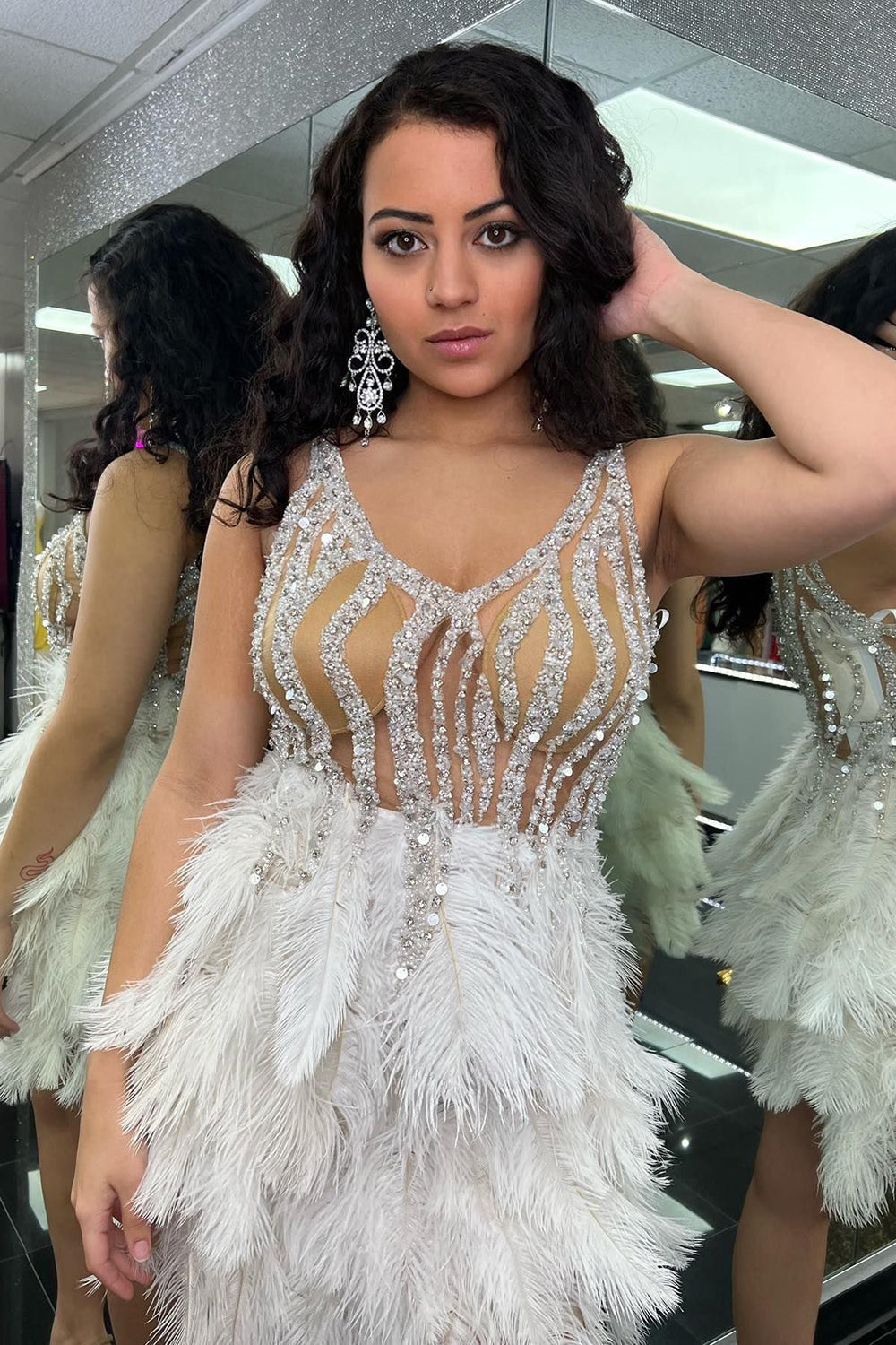 Fancyvestido this tight white homecoming dress features a v-neck, a sheer corset bodice adorned with beads, a tight feather skirt, and a zipper back.