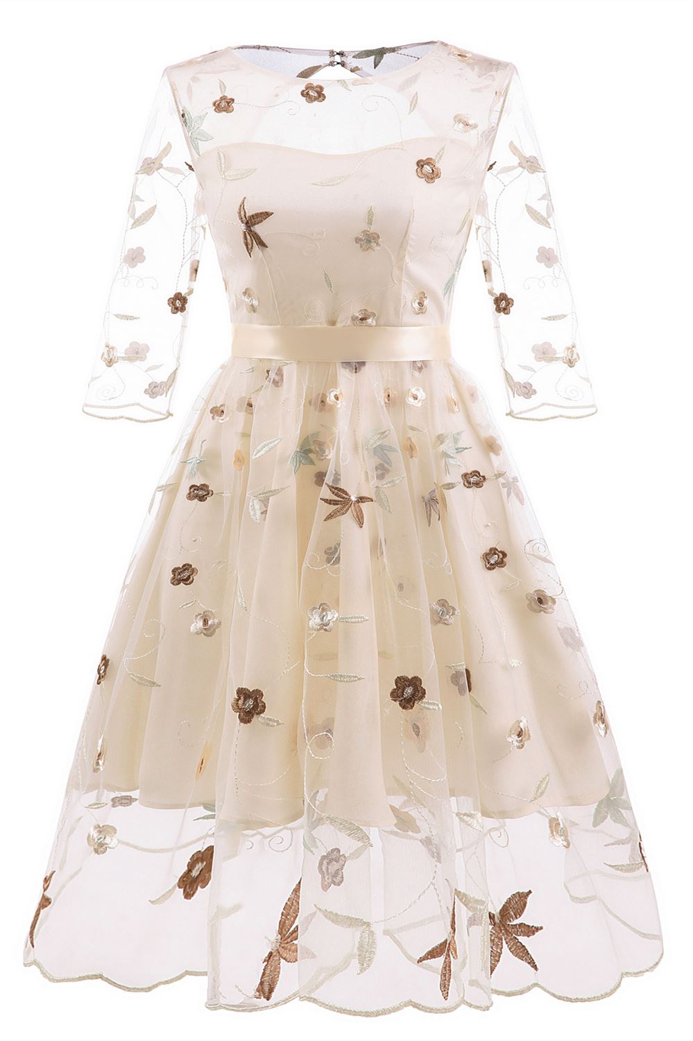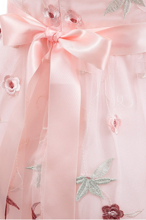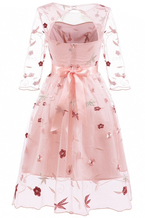 Vintage Pearl Pink Embroidery Party Dress with Illusion Sleeves