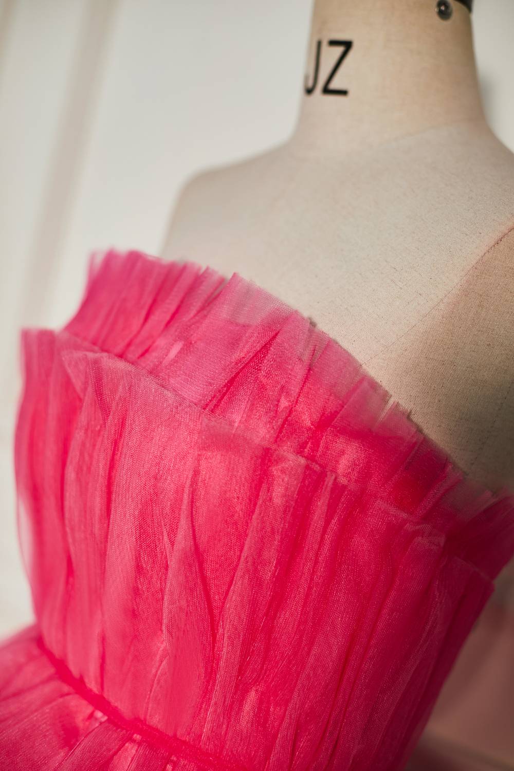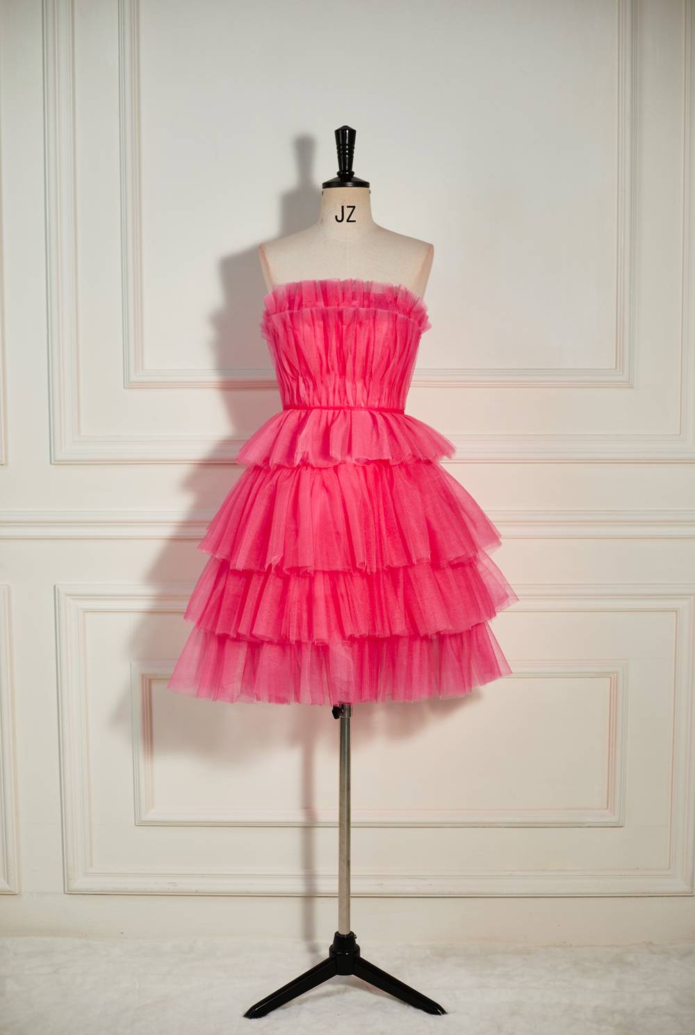 Fancyvestido this short watermelon homecoming dress features a strapless neckline with ruffles, a pleated bodice, and a multi-layer a-line skirt.