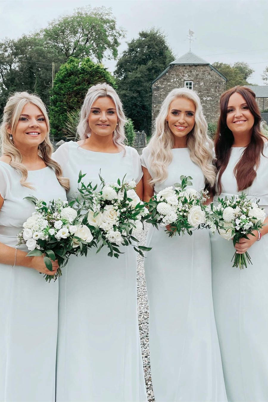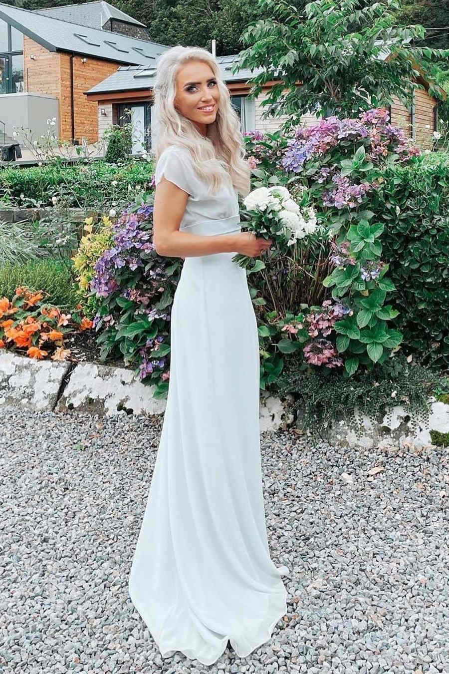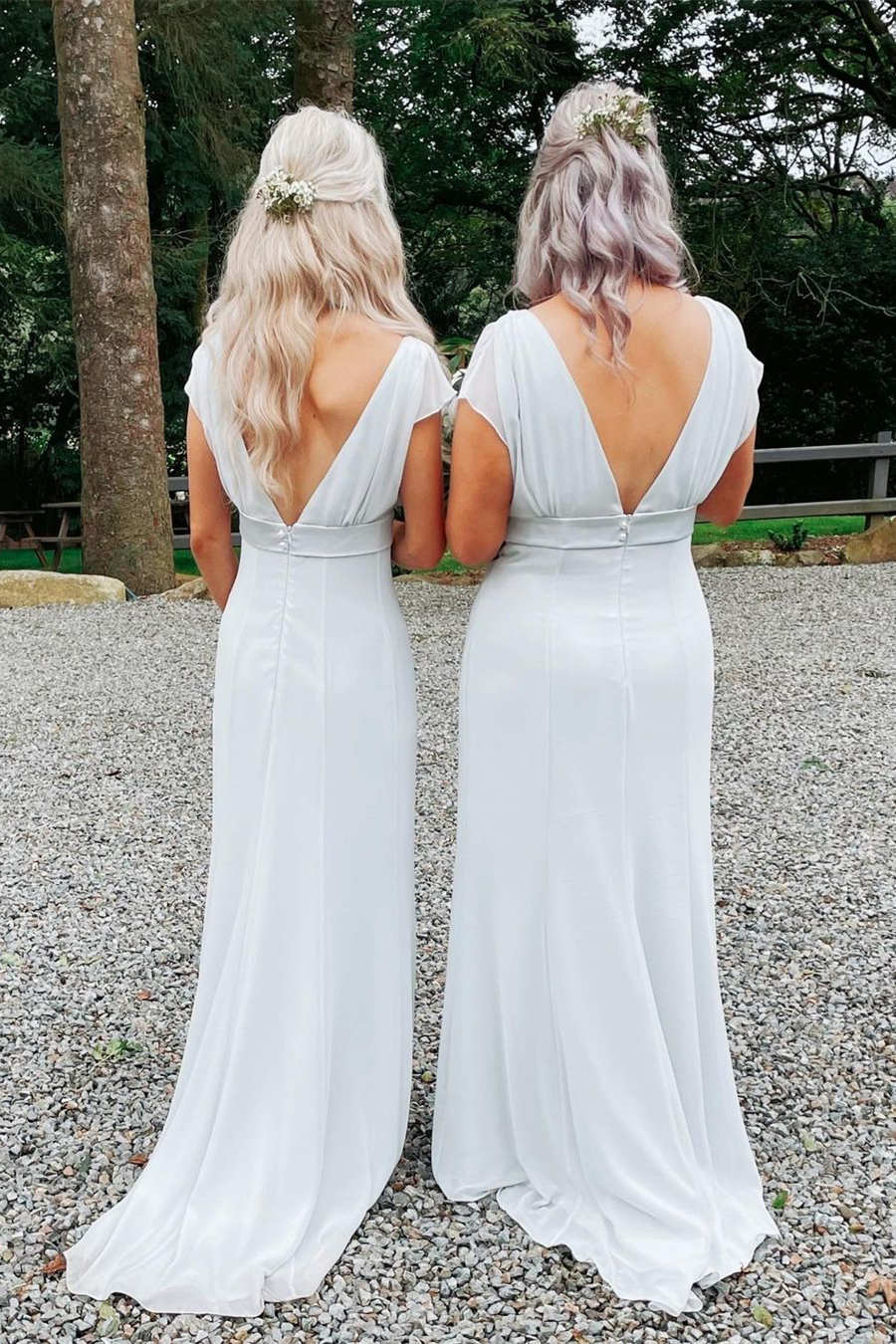 Elegant white long bridesmaid dress features with crew neck, satin sash and zipper back.
