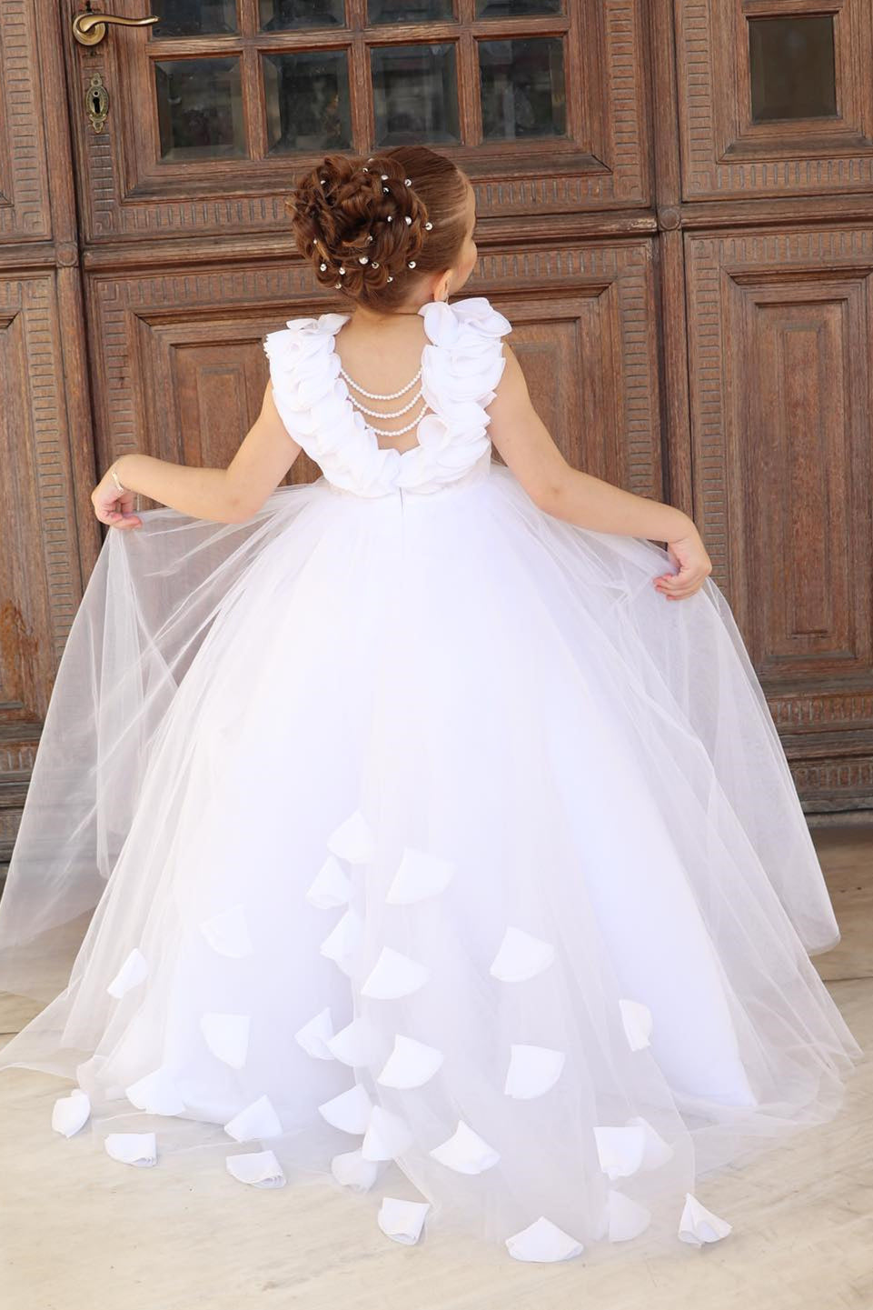This cute white flower girl dress features a crew neck, a lace top with ruffles, and a beaded back.