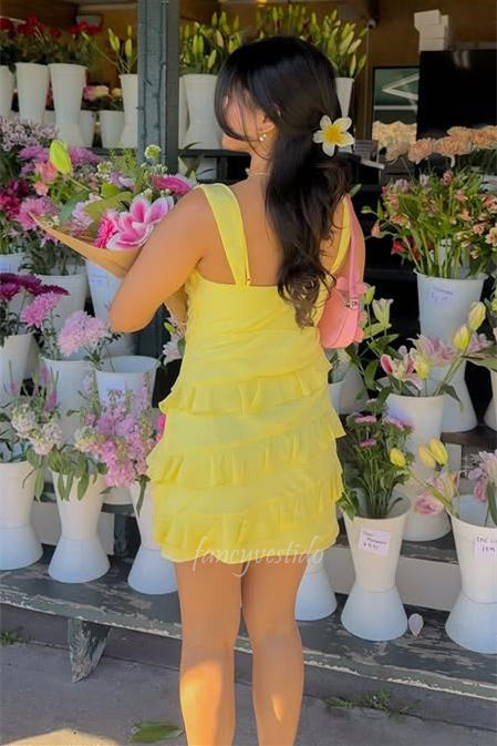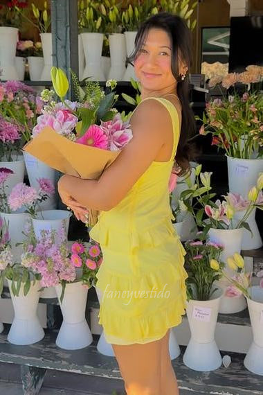 Yellow Straps Layered Short Party Homecoming Dress