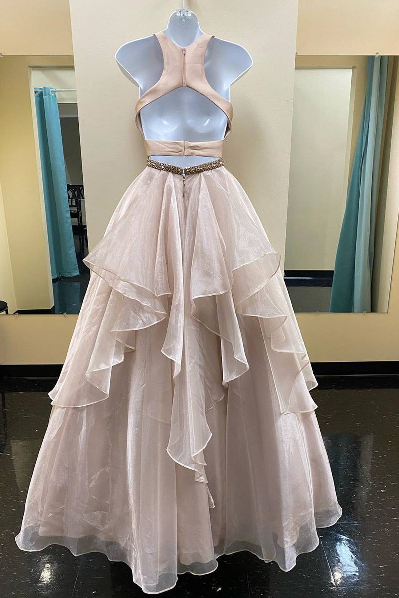 Two Piece Cascading Ruffles Long Champagne Prom Dress