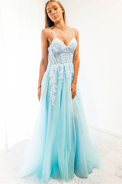 Blue A-line Spaghetti Strap Long Prom Dress with Appliques