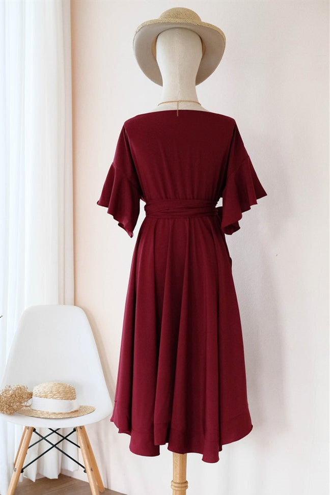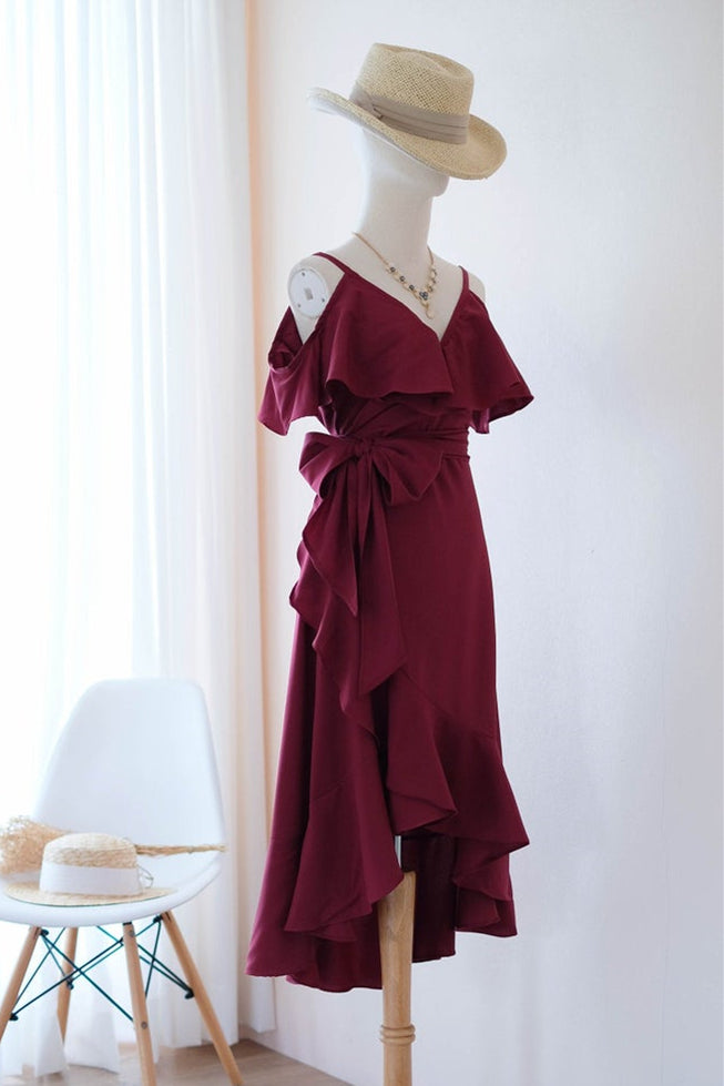 Elegant High-Low V-Neck Burgundy Homecoming Dress with Ribbon