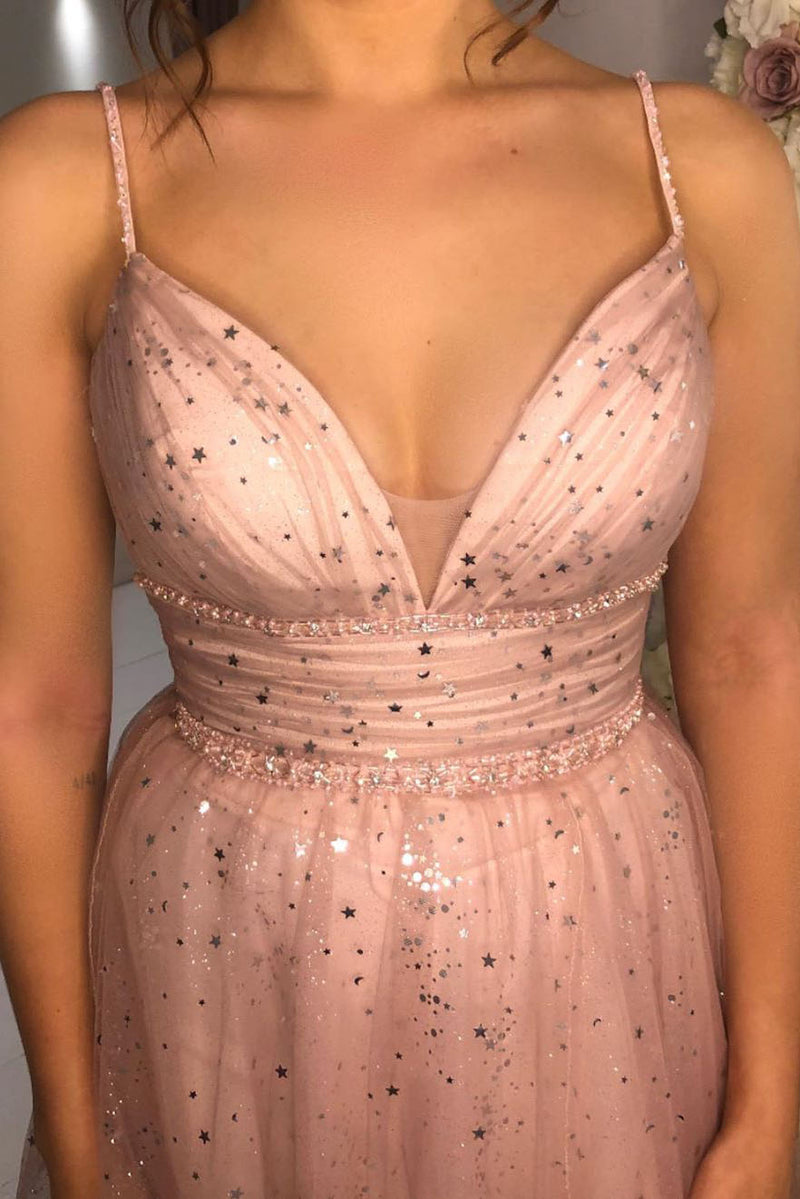 A-Line Straps Empire Pink Long Tulle Prom Dress with Sparkles