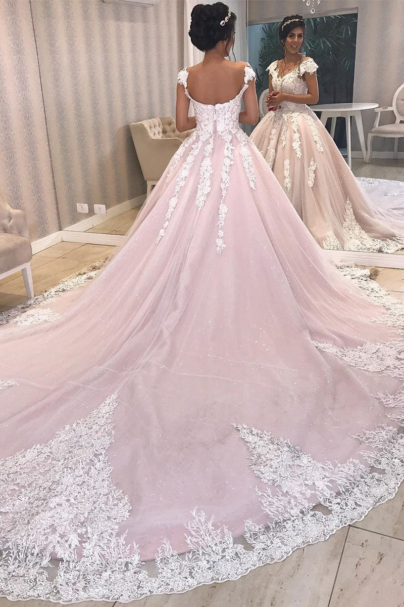 Princess Cap Sleeves A-line Long Pink Wedding Dress with Lace