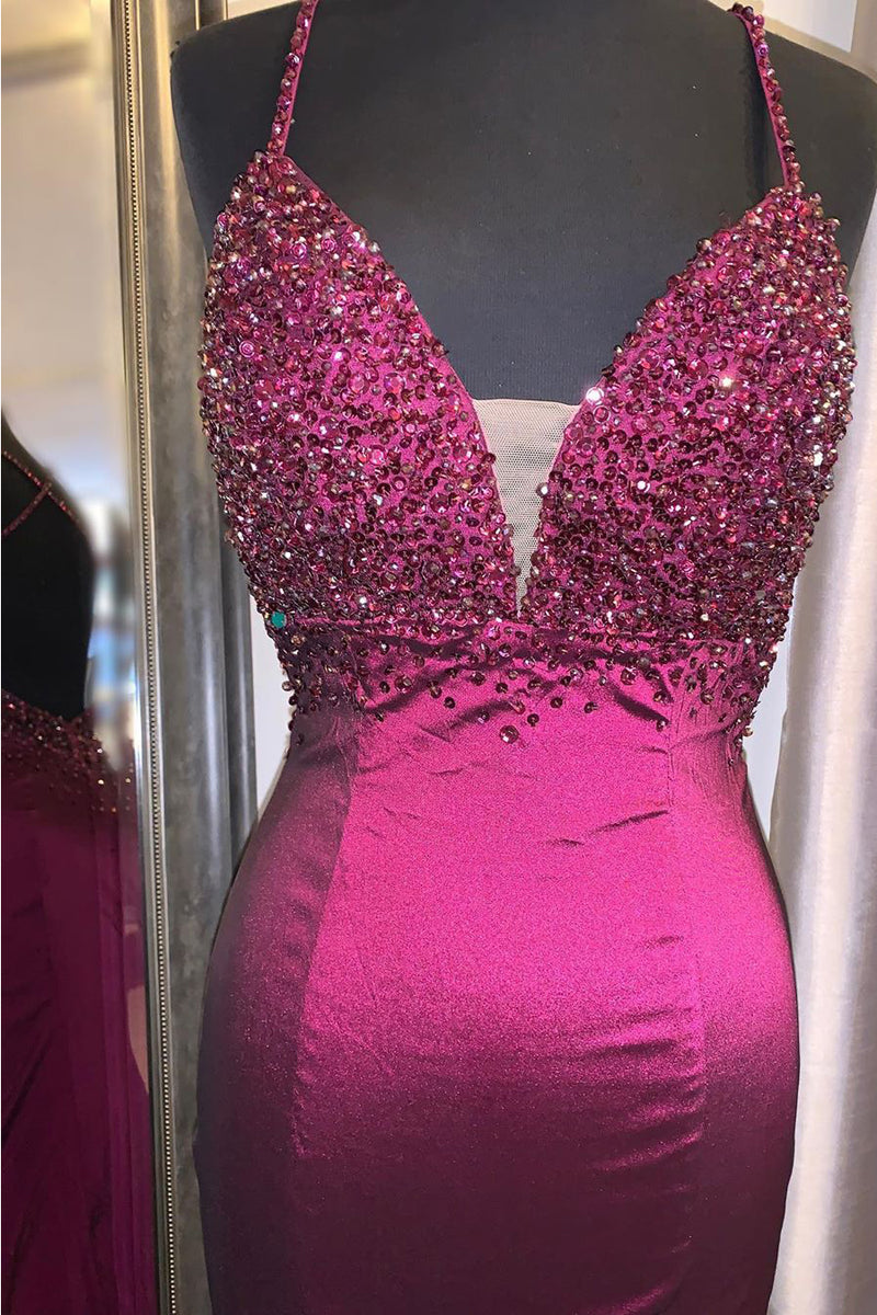 Gorgeous V Neck Mermaid Beaded Dark Purple Long Prom Dress
