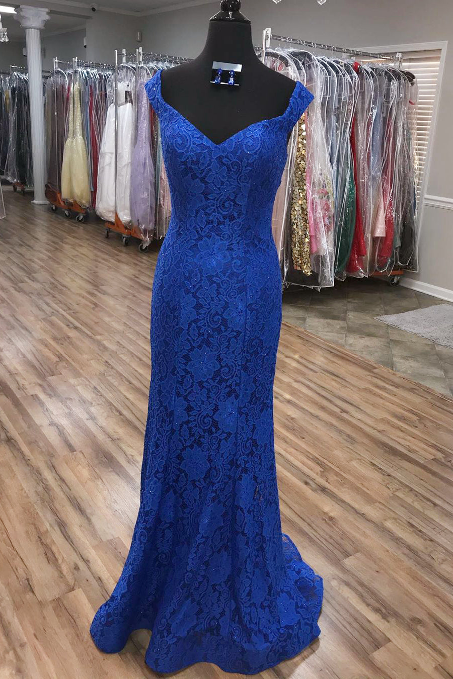 Elegant V Neck Mermaid Royal Blue Long Lace Prom Dress
