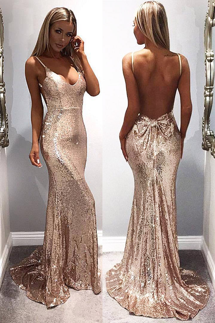 Mermaid Sequins Gold Long Prom Dress with Open Back