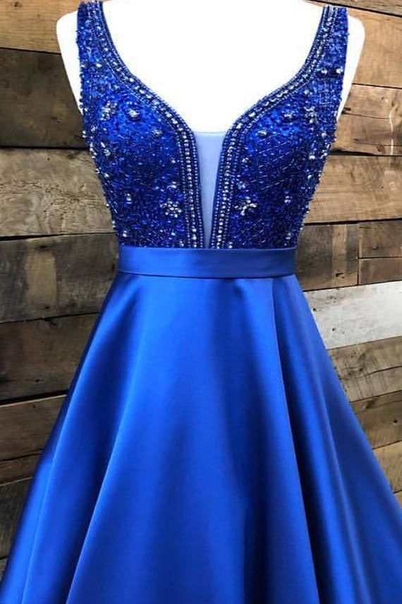 Straps Satin Royal Blue Long Prom Dress with Beading Top