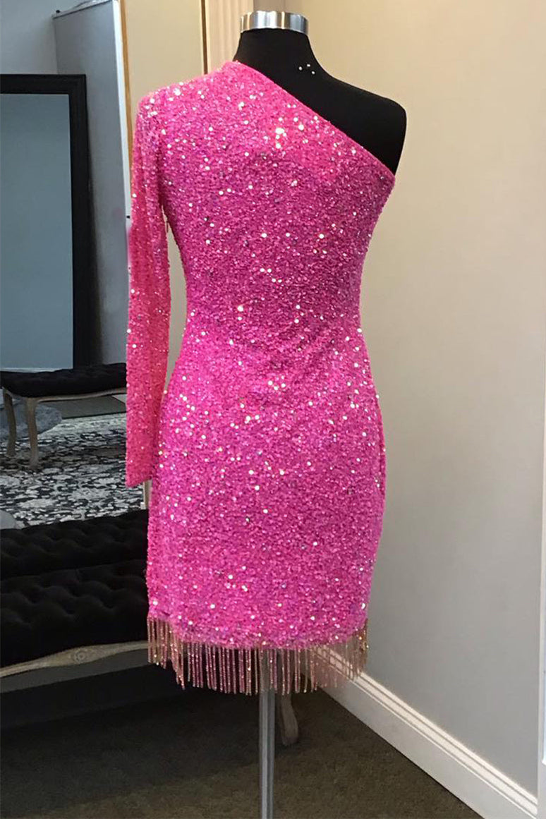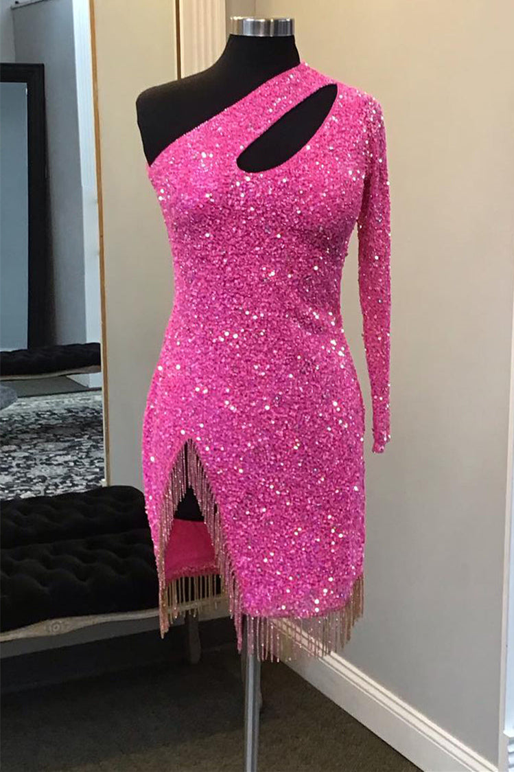 Hot Pink One Shoulder Cutout Long Sleeve Short homecoming Dress with Tassel
