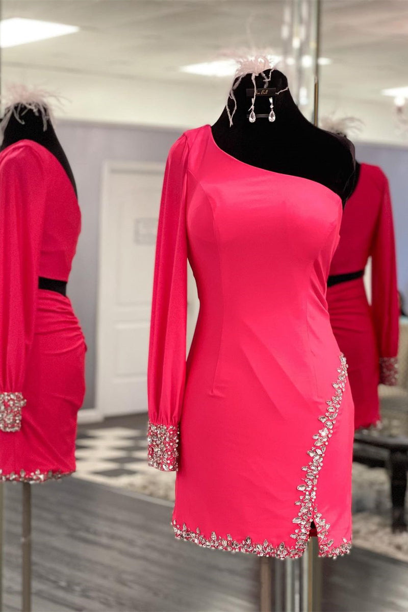 Elegant Hot Pink Sequins Long Prom Dress with One Shoulder