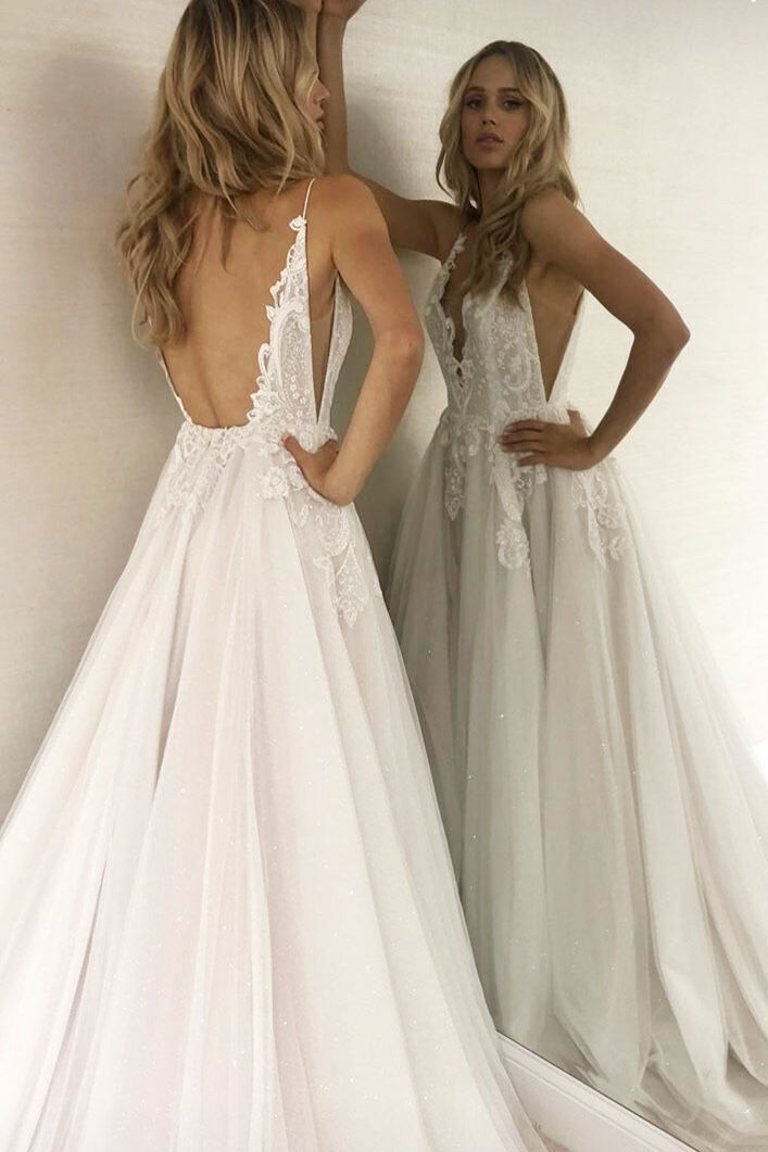 Deep V-Neck Open Back Long White Wedding Dress with Lace