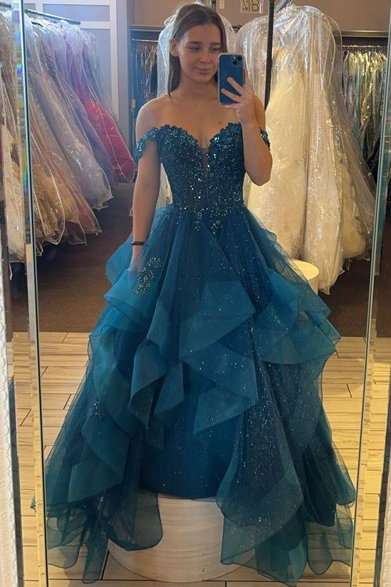 Sweetheart Lace Applique Layered Prom Dress with Off Shoudler
