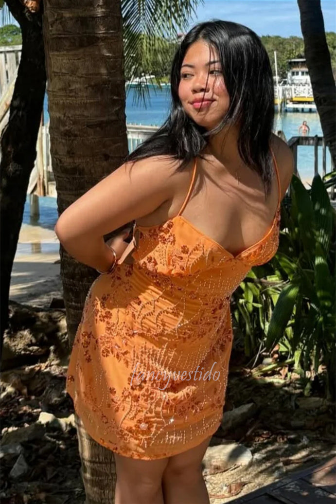 Spaghetti Straps Tight Short Homecoming Dress with Floral