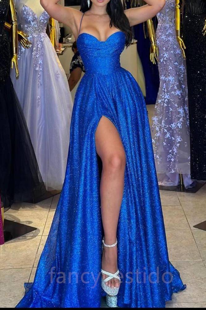Blue Straps Applique Pleated Mermaid Prom Dress with Slit
