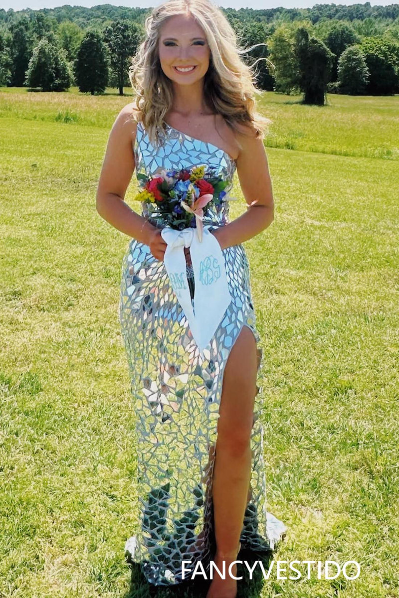 One Shoulder Mirror Sequin Mermaid Prom Dress with Slit