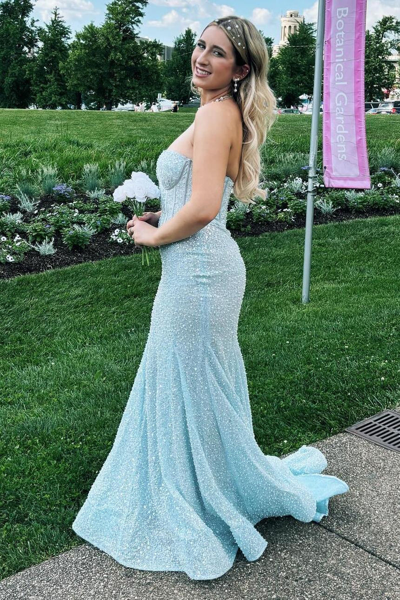 Strapless Blue Sequin Long Mermaid Prom Dress