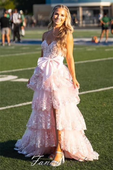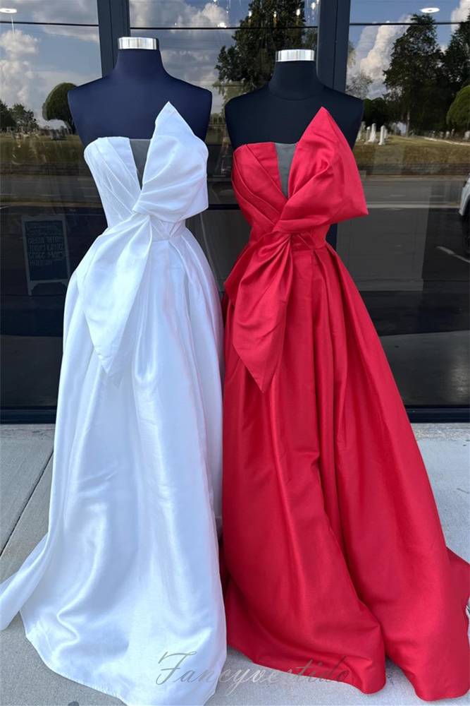 Strapless Applique Ruffle Silt Prom Dress with Bow