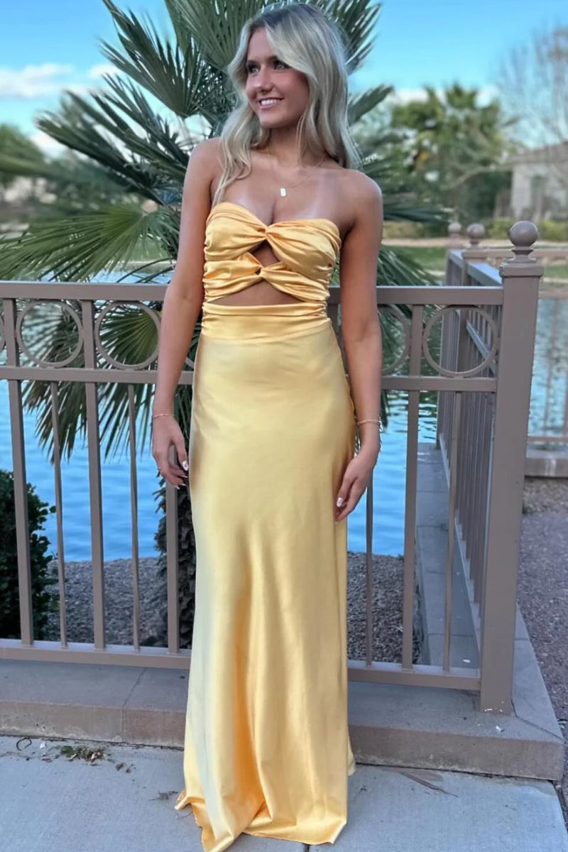 Yellow Strapless Mermaid Long Prom Dress with Bow