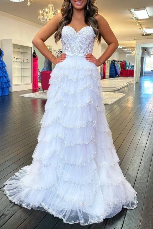 Sweetheart White Applique Tiered Prom Dress with Bow