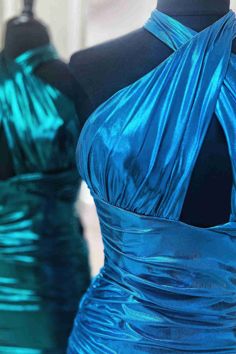 Halter Metallic Green Keyhole Pleated Mini Dress