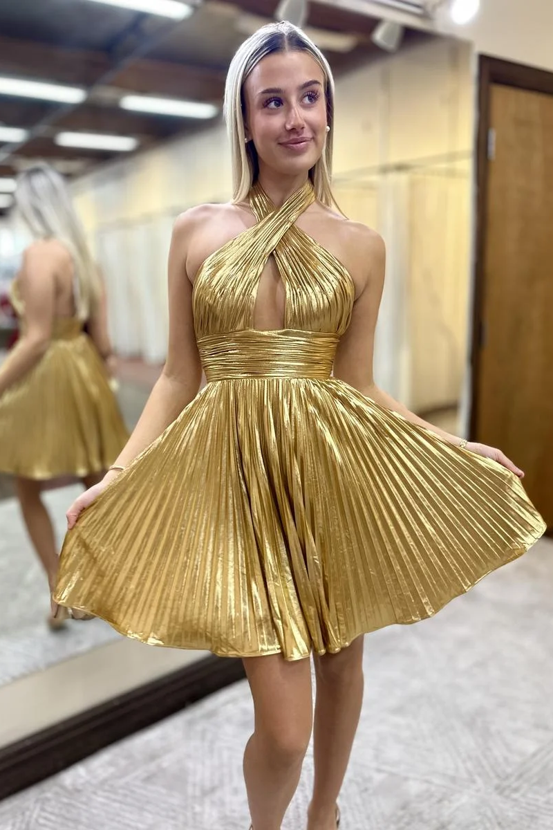 Metallic Fuchsia Halter Keyhole Pleated Short Homecoming Dress
