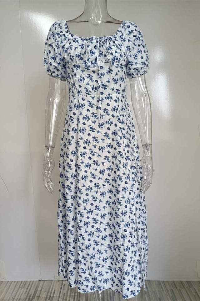 Blue French Floral Square Neck Puff Sleeve Midi Dress